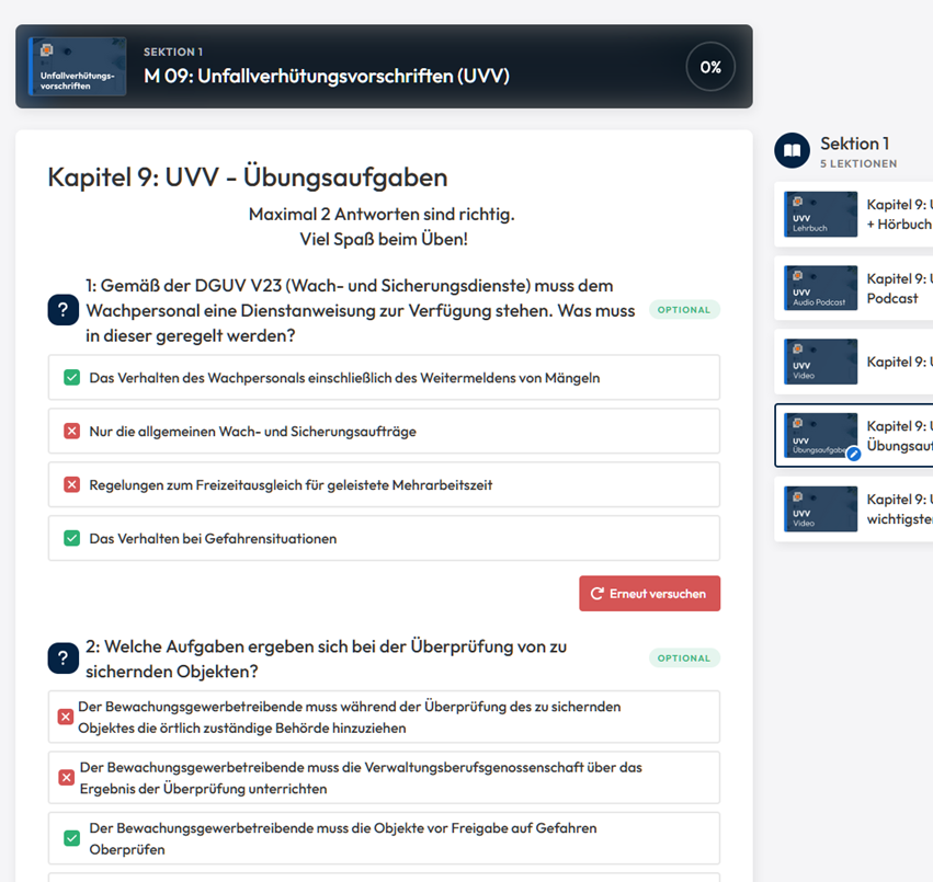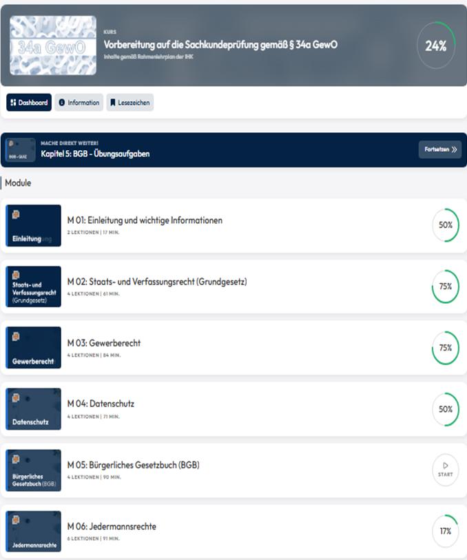 Sie erhalten Zugriff auf ein exklusives Lernpaket mit allen Inhalten zur eigenständigen Vorbereitung auf die Sachkundeprüfung für das Bewachungsgewerbe gemäß §34a GewO.