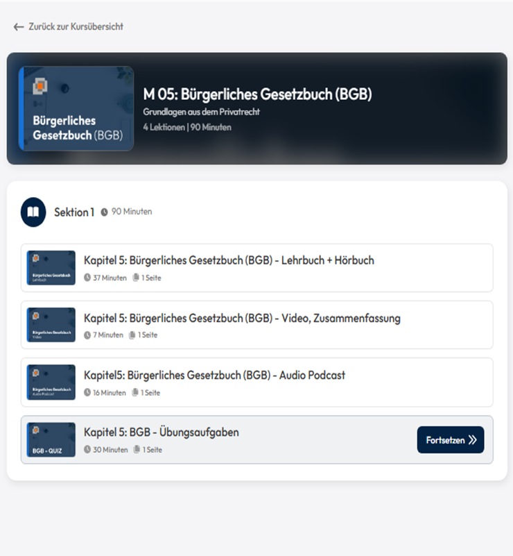 Das Lernpaket enthält das vollständige digitale Lernmaterial zur Vorbereitung auf die Prüfung im Selbststudium. (Lehrbuch, Hörbuch, Video-Präsentationen und Audio-Podcasts)
